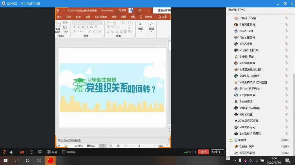 2020年03月16日15:00,生工公司员工党支部开展毕业生党员党组织关系转接党课学习。参与本次党课的有支部中共党员、中共预备党员共30人。