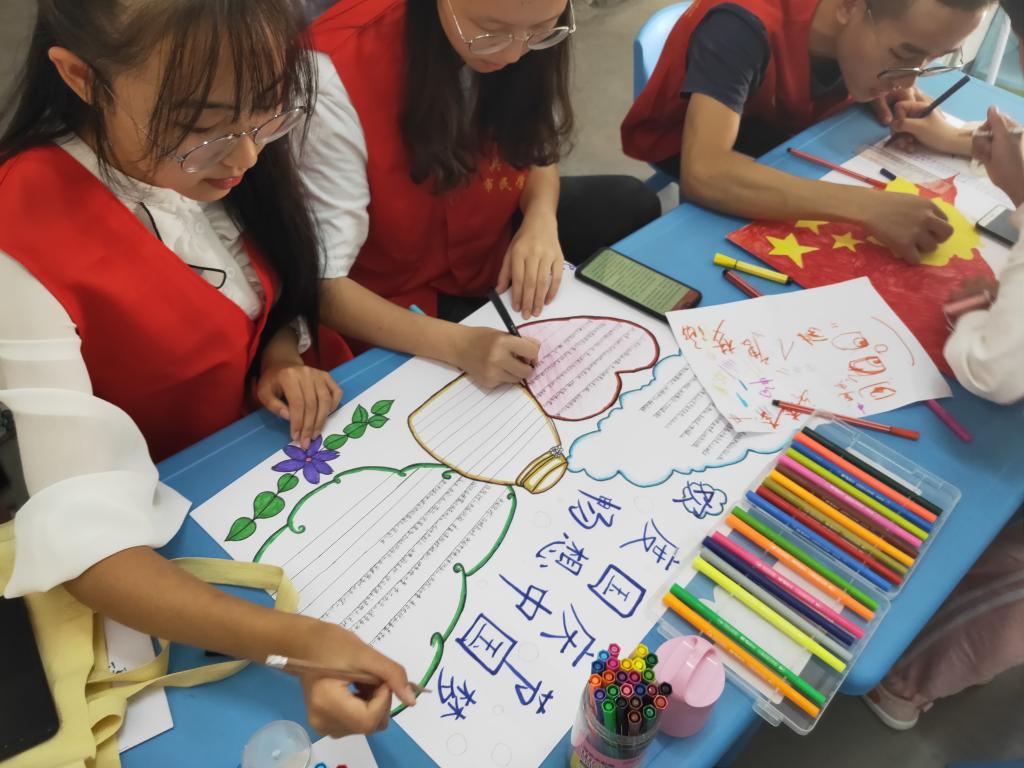 上午9:00全体成员顺利抵达长龙社区,进行“为祖国添彩”志愿服务活动。为了充分调动孩子们的积极性,志愿者们先陪着小朋友们一起做游戏,跳绳、唱歌、抢板凳等,孩子们玩得不亦乐乎。休息片刻,孩子们拿起手中的画笔,在各位志愿者的引导下,认真地进行创作。一笔一划充满着对祖国母亲的敬意,纸张上,鲜艳的五星红旗随风飘扬,畅想中国梦早日成为现实。画下几个许愿瓶,写上对祖国母亲70周年生日真挚的祝福。七十年的沉淀,铸就今天的辉煌,祝福祖国的明天,天更蓝,山更绿,水更清,早日实现中华民族的伟大复兴。