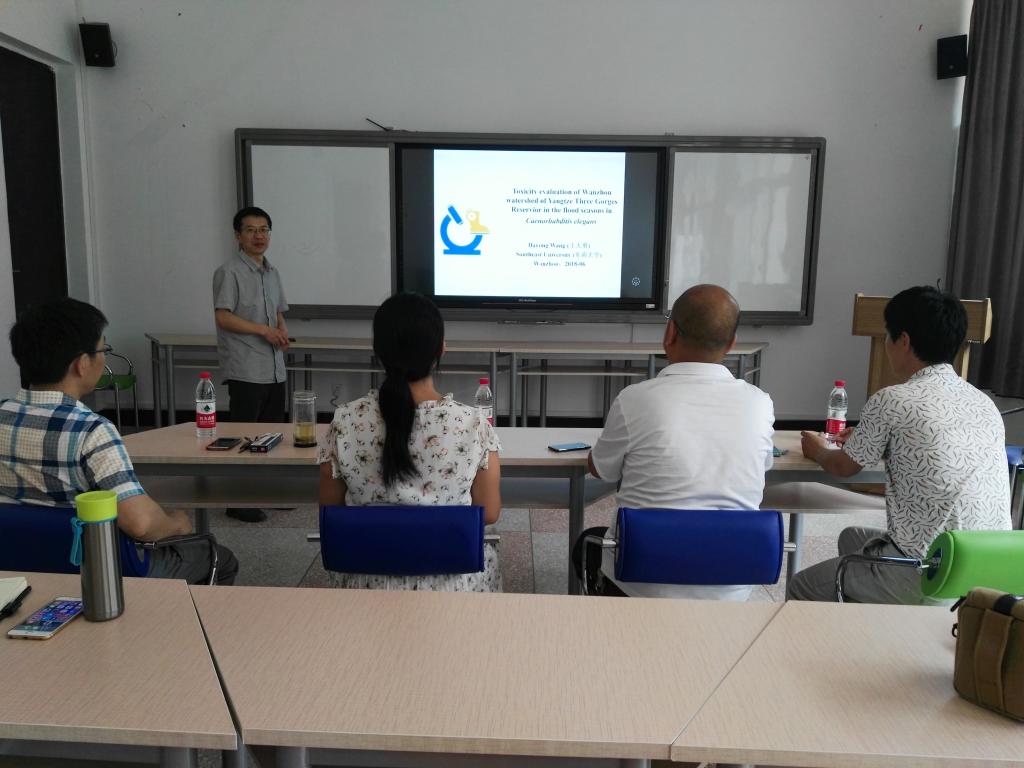 2018年06月29日下午,beats365官方网站柔性引进的东南大学王大勇教授在百安校区理科楼B1-216室举办了以《秀丽线虫在三峡水库污染物毒理效应评价中的应用》为题的学术讲座,公司部分师生参与了本次讲座。