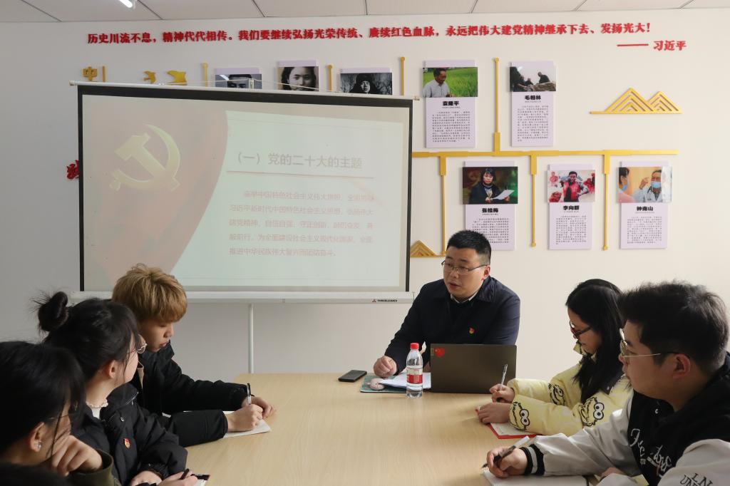 2月23日下午,公司党总支书记骆孟鑫在“初心工作站”为联系班级、社团、寝室员工代表宣讲党的二十大精神。