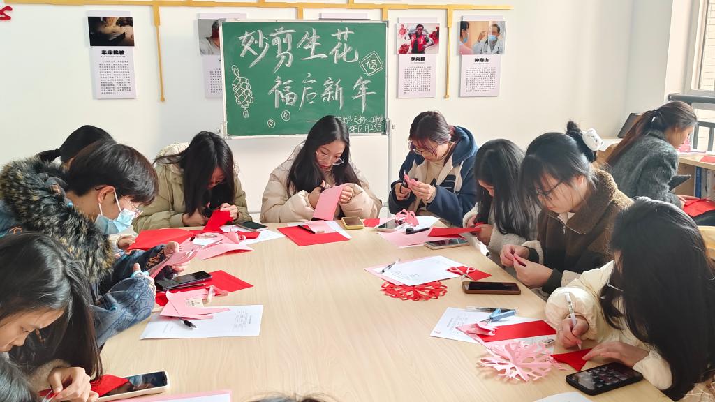 工作人员介绍道:“剪纸是中国民间艺术的一块瑰宝,作为我国的传统手工艺术,具有源远流长的历史。”同学们拿到材料后就开始构思,并认真地操作起来。剪纸完成后,同学们纷纷表示要合影留念。虽然平时很少接触剪纸,但同学们为了能做出自己满意的作品,专心致志地学习着,努力为新的一年增添一笔浓浓的年味。活动在欢声笑语中圆满结束,大家表示,在感受中国传统文化的同时,很好地缓解了期末复习压力,放松了心情。
