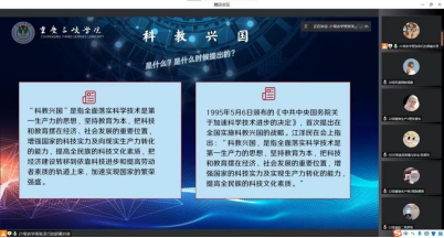 活动开始,主讲人张泽巧带领大家了解2021年中国取得的部分科学成就,再从科教兴国战略的提出、发展和现阶段的丰富内涵展开学习,共同领悟实施科教兴国战略、强化现代化人才支撑、筑牢国家强盛之基的重要性。视频中党的二十大代表对“科教兴国”的解读,也充分强调科教兴国战略对中国的伟大复兴具有保障作用和推近作用。会后,同学们纷纷表示,通过本次学习,加深了同学们对“实现科教兴国,强化现代化人才支撑”的了解,激发了同学们的爱国热情与奋斗力量。