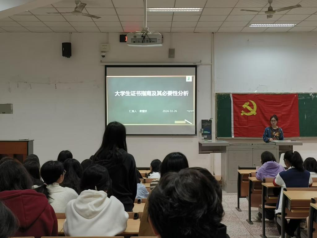 主讲人唐慧妍同学分析了老员工考取证书的必要性,介绍了证书的概述与分类、热门证书详解及实用性分析、证书考取的策略与建议,用张雪峰老师的视频进一步强调了哪些是有用的证书,该如何考取相关的证书。活动尾声,同学们积极分享了自己考取证书的经验,纷纷表示对考取证书有了更加清晰的目标。