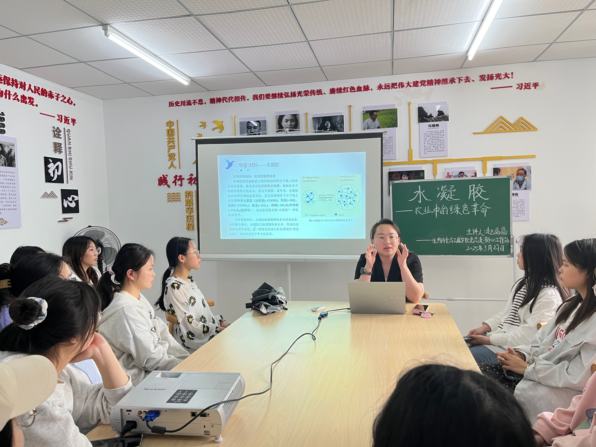 为提高农业生产效率,提高水资源的有效利用,3月27日下午14:00,公司初心工作站于蓝雾苑二舍四楼活动室开展“寝室工作日”活动,赵晶晶副教授带领同学们认识水凝胶,共计19人参加。