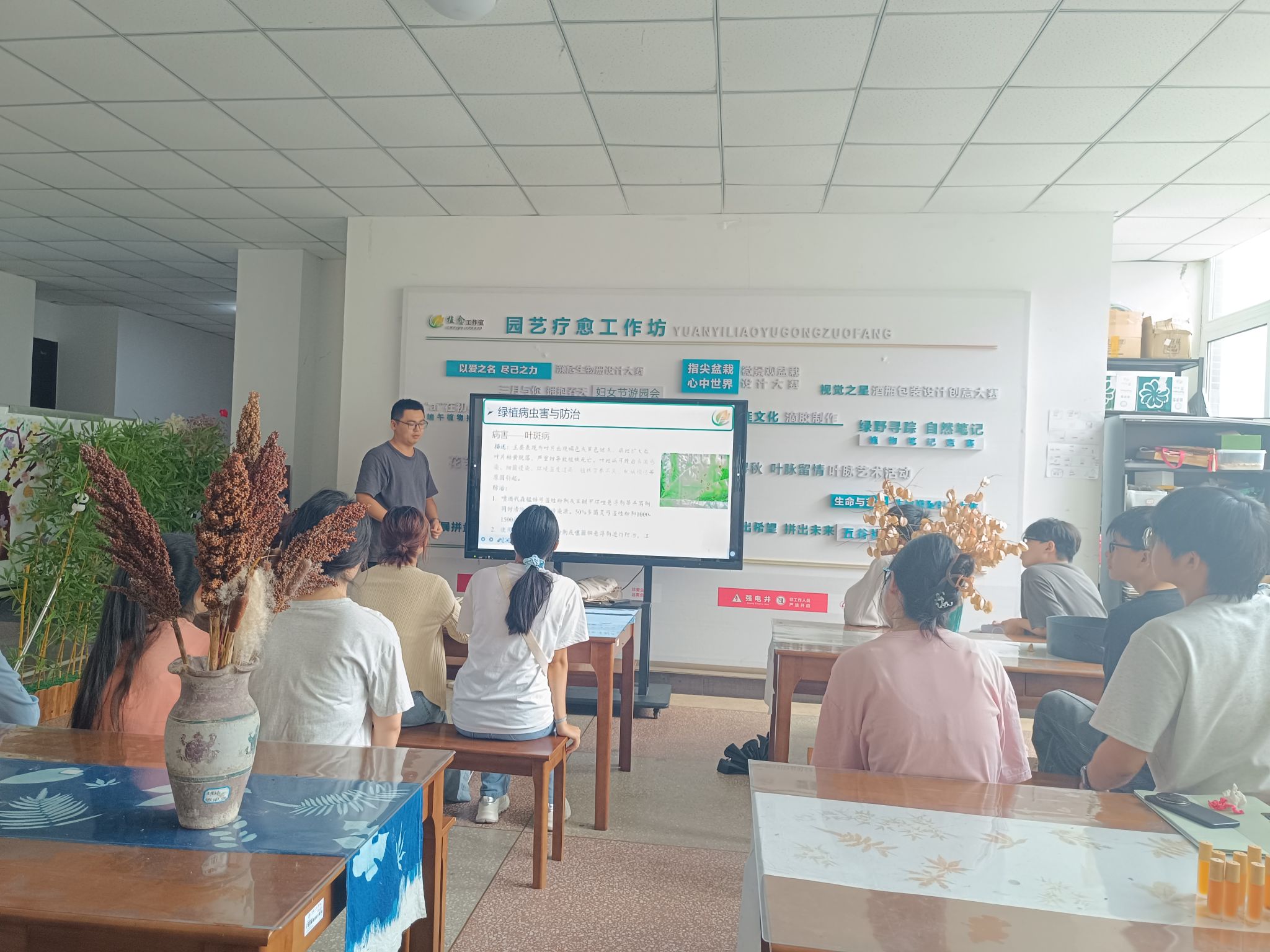 活动前期,李老师开展了简单的植物科普,介绍了常见的植物病虫害,如叶锈病、烟煤病等。随后,志愿者们带着工具共同参与盆栽的修剪与养护工作。在老师的指导下,志愿者们分工协作,认真修剪残枝败叶,清理杂草,确保每一株植物焕然一新。最后,大家共同为盆栽喷洒水分,细心呵护这些绿色的生命。