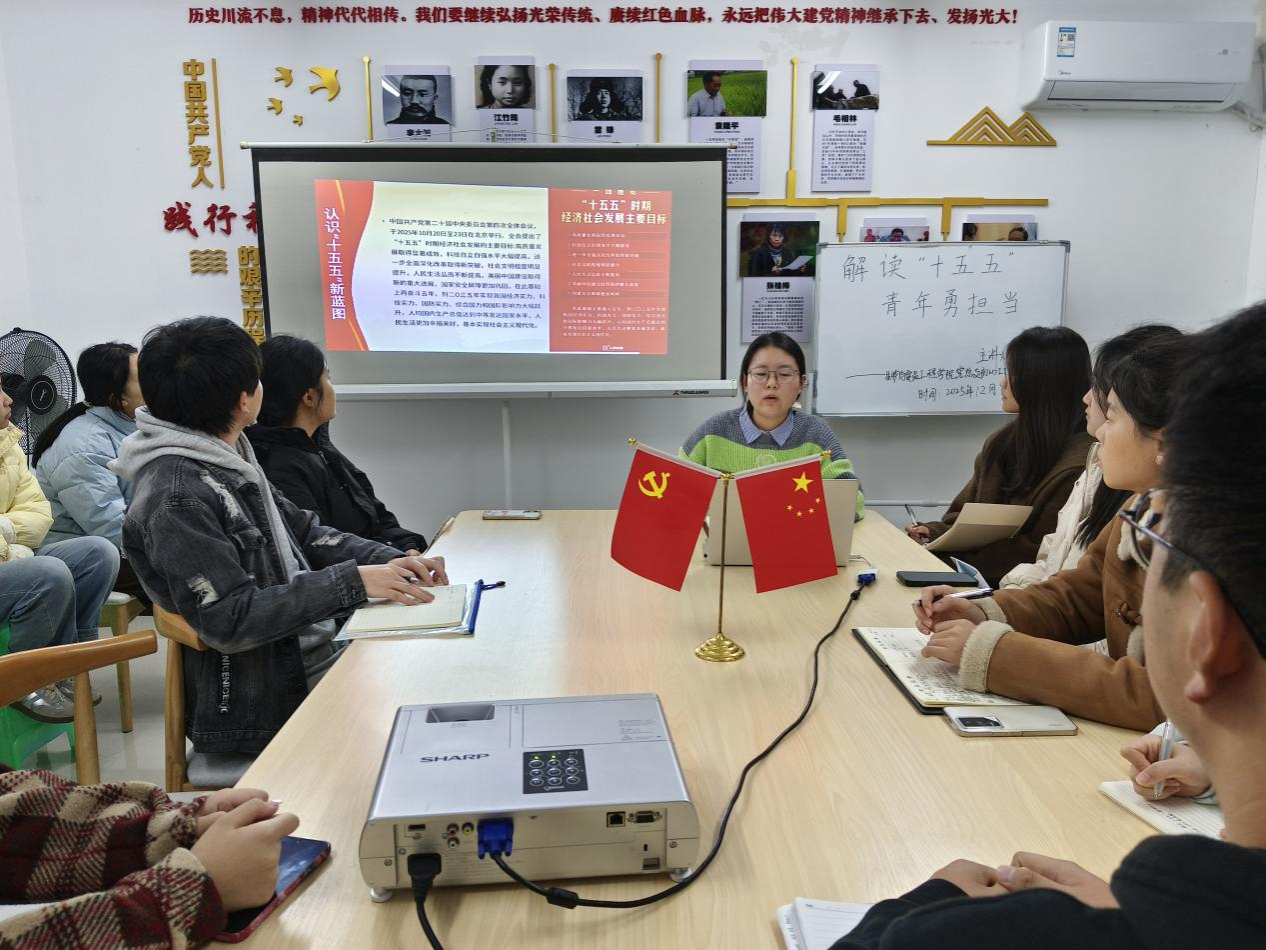 12月6日20:00,公司初心工作站于蓝雾苑2舍4楼活动室开展第28期“理论学习”活动。李洪琳同志以“解读‘十五五’,青年勇担当”为主题展开分享。共计15人参加。