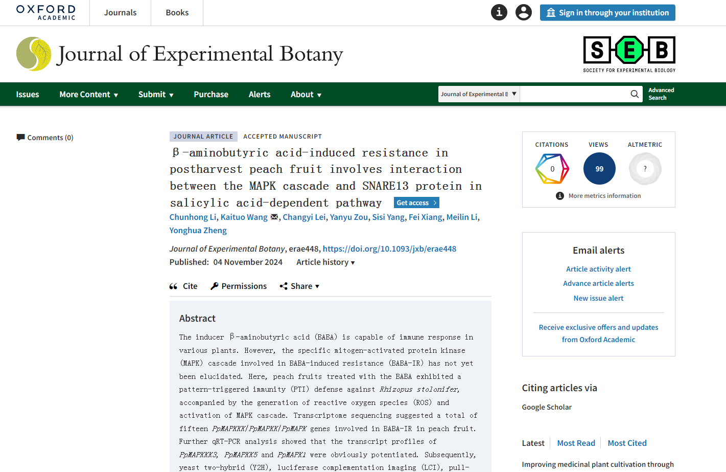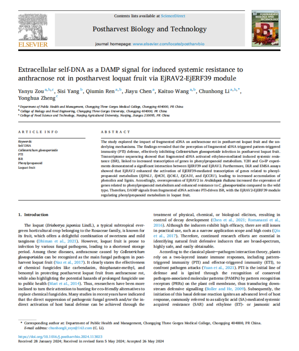 近日,beats365官方网站教师在植物学经典期刊《The Plant Journal》和《Journal of Experimental Botany》和采后生物学期刊《Postharvest Biology and Technology》上分别发表了三篇重要论文。首篇《VOZ-dependent priming of salicylic acid-dependent defense against Rhizopus stolonifer byβ-aminobutyric acid requires the TCP protein TCP2 in peach fruit》由汪开拓作为第一兼通讯作者,联合南京农业大学郑永华团队,发现维管植物单锌指转录因子(VOZ1和VOZ2)通过调控TCP2和ICS基因,显著增强了桃果对Rhizopus stolonifer的抗病能力;次篇《β-aminobutyric acid-induced resistance in postharvest peach fruit involves interaction between the MAPK cascade and SNARE13 protein in salicylic acid-dependent pathway》由三峡医专黎春红作为第一作者,汪开拓为通讯作者,阐明了诱导剂β-氨基丁酸(BABA)在桃果中激活的MAPK级联反应及其下游因子SNARE13在提升水杨酸依赖防御中的关键作用;第三篇《Extracellular self-DNA as a DAMP signal for induced systemic resistance to anthracnose rot in postharvest loquat fruit via EjRAV2-EjERF39 module》由已毕业本科生邹燕羽为第一作者,系统揭示自源性DNA诱导对枇杷果实抗性反应中的诱导作用。这三项成果为植物免疫机制和抗病育种提供了新的科学依据,推动了农业可持续发展的研究进展。