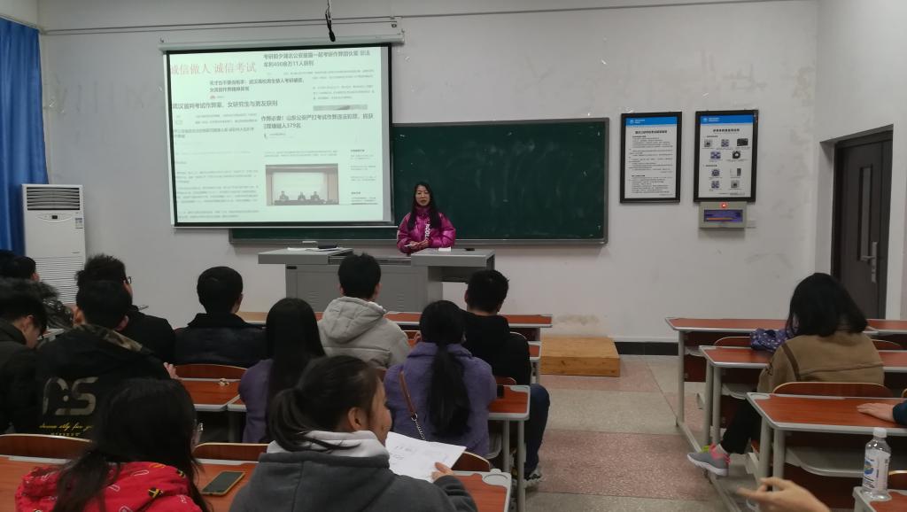 12月29日,公司于慎思楼四栋402、405、406、408等教室召开以“重视期末教育考试,注重实践锻炼”为主题的专题教育大会,旨在树立同学们的诚信理念,加强同学们的安全意识。学工办副主任李华林,辅导员向丽霞、蒋园园、陈华华主讲,公司全体同学参会。