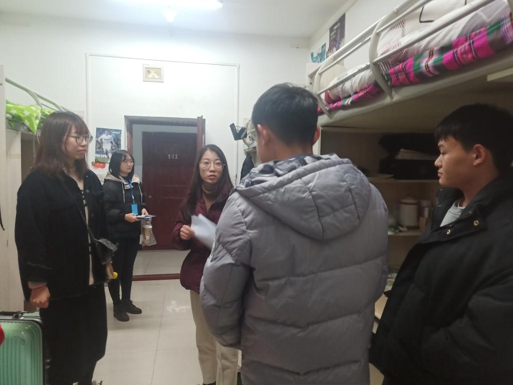 在走访员工寝室的过程中,老师们亲切地与同学们交谈,贴心询问同学们的近况,针对同学们提出的问题进行解答,并给予宝贵的意见;针对大四同学,老师们还询问了考研情况与实习、就业情况,并给与亲切指导。其次,老师们还提醒同学们抓紧期末复习,做好学习、工作和生活规划,积极备考,诚信参考。同时,强调了“两节三夜”的安全问题,必须严格履行请销假手续,注意宿舍及出行安全,告诫同学们应注意寝室用电安全,搞好寝室卫生,营造优良的寝室环境。