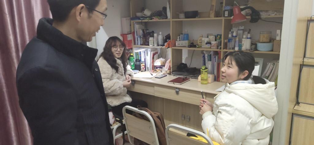 12月17日16:30,公司经理肖国生,学工办副主任李华林,辅导员向丽霞、蒋园园深入员工寝室,为同学们带去温暖与关怀。本次走访旨在排查宿舍安全隐患,了解同学们的期末学习、生活状况,加强师生间的交流。