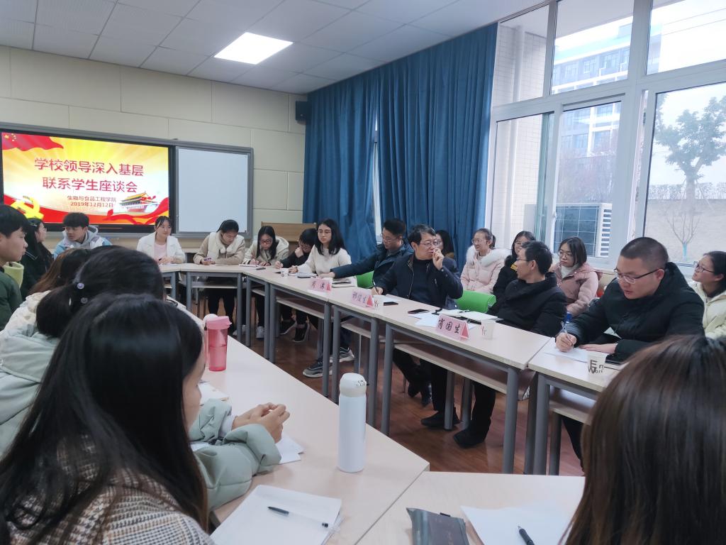 12月12日下午16:30,生工公司在慎思楼2栋216会议室召开了公司副董事长祁俊生深入基层联系员工座谈会,公司肖国生经理、周浓副经理、学工办副主任李华林、辅导员向丽霞老师,2017级食品科学与工程2班、桂花苑5舍201全体同学,生物科技协会员工代表共计60余人参会。