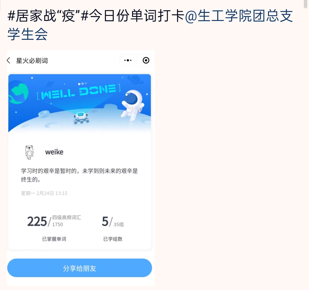 2月26日至3月2日,公司共发布两弹线上打卡活动:英语学习及美食制作,公司同学积极响应,晒出自己“宅”家打卡的照片。英语学习打卡方面,同学们背诵四六级单词,阅读外国经典文献,了解时事政治,熟练掌握英文语法;美食制作方面,火锅、烙饼、清汤面等,应有尽有,琳琅满目。其中,亮眼作品在公司团总支微信公众号上发表展示,号召更多同学展示生活小技能。居家隔离的同时,提升自我能力,做到居家学习两不误!