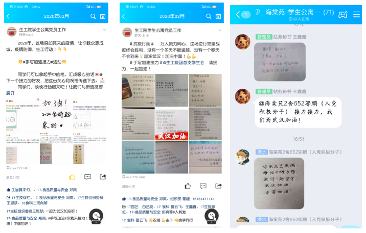2020年02月05日,生工公司员工公寓党员工作站通过官方QQ线上发布“老员工疫情防控倡议书”并开展线上“手动加油接力”活动。旨在呼吁大家积极响应国家号召,共同抵御疫情的同时,致敬奋战在一线的工作者们,为“抗疫行动”加油。