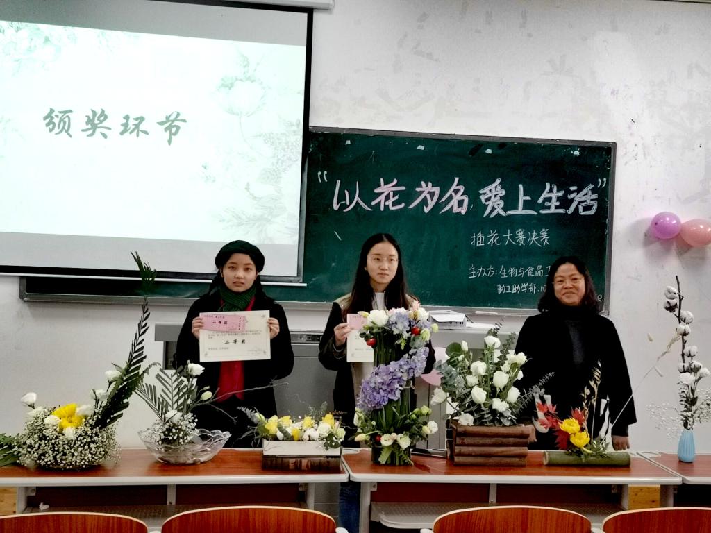 首先,各位参赛选手前往406教室进行一个小时的插花制作,观众留在405教室进行园艺趣味知识游戏。插花过程中,各选手们时而交流构思,时而拿起插花工具精雕细琢,时而驻足远观近看……现场气氛十分活跃,各小组都作出了富有特色的主题作品。一小时后,迎来了各位参赛选手作品的展示,选手按次序为评委老师和观众讲述作品的设计理念以及所表达的含义。最后通过评委打分和观众投票评选出一等奖一名,二等奖两名,三等奖三名,优胜奖四名。