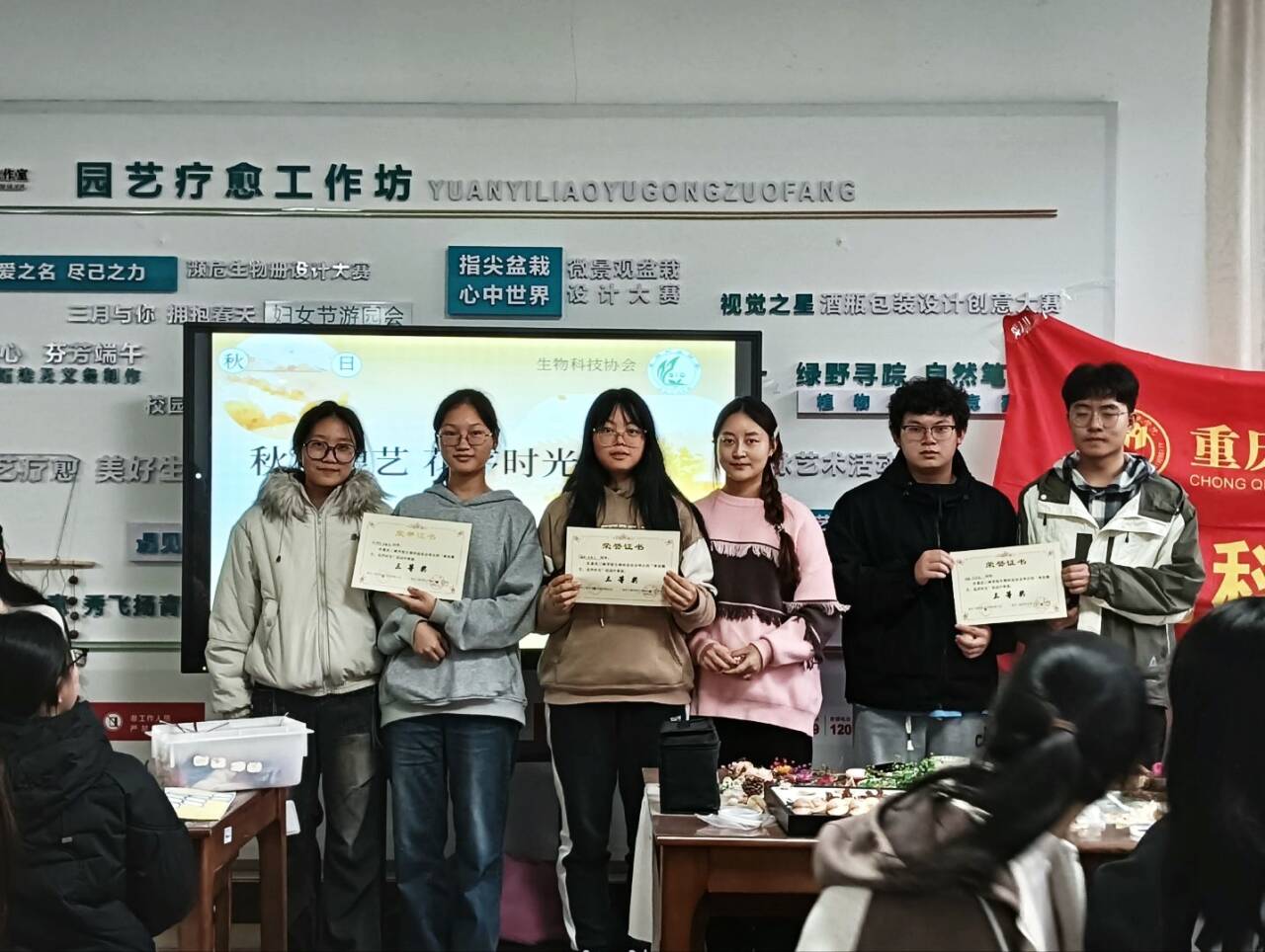 2025年11月7日,公司生物科技协会于慎思楼植愈工作坊成功举办“秋枝酿艺,花叙时光”花艺创意比拼活动。十组参赛成员以空白扇面与画框为创作载体,巧妙融合鲜花枝叶与传统器物,于一小时内完成了各具特色的花艺作品。