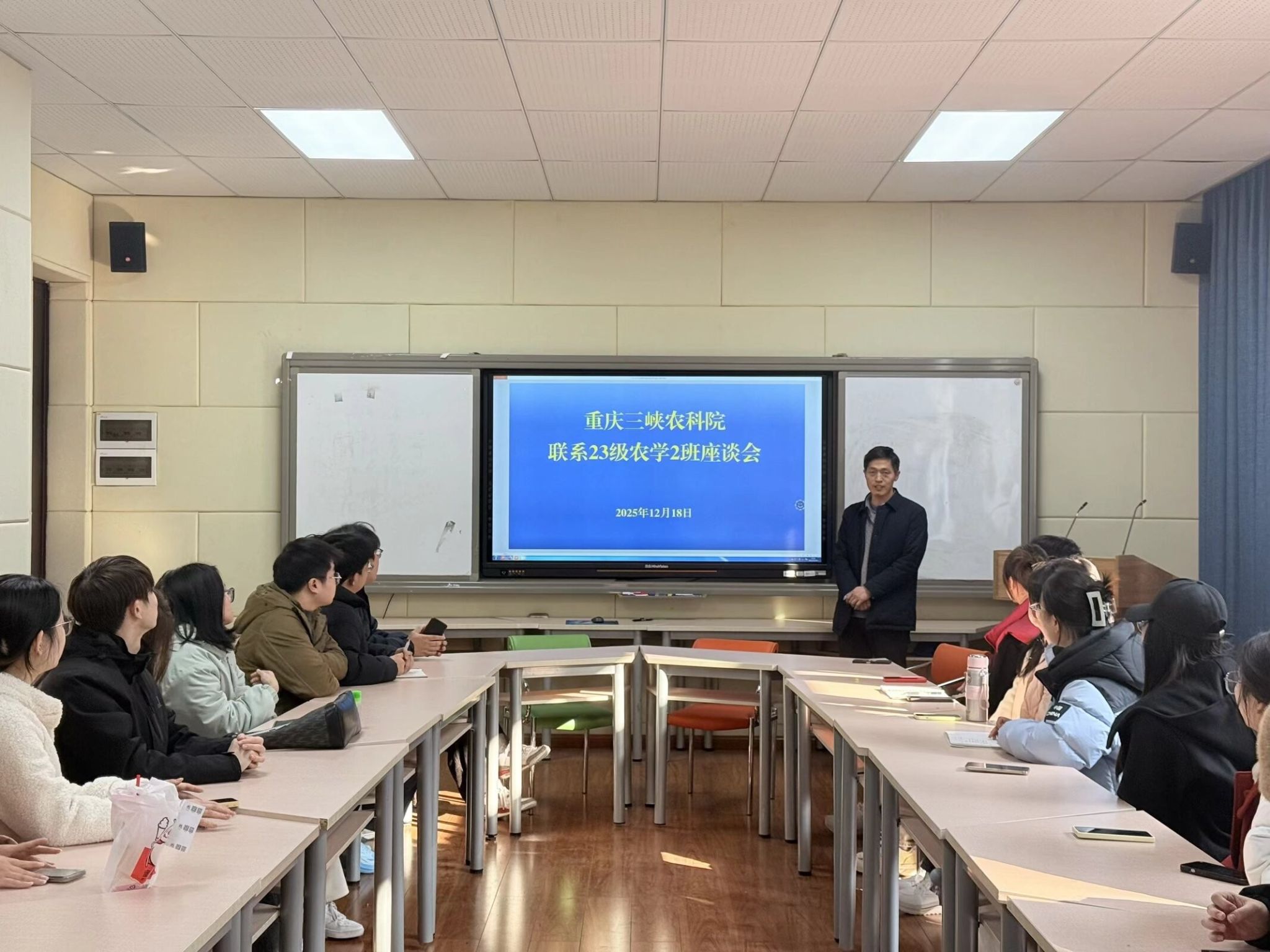 2025年12月18日,重庆三峡农科院与公司23级农学2班的交流座谈会在慎思2-216举行。本次座谈会旨在搭建校院协同育人的桥梁,帮助农学专业员工直观了解农业科研机构的运作模式与前沿技术应用场景,引导员工明确专业发展方向,认知行业实践需求,农科院经理戚文华出席座谈会。