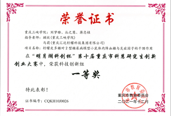 2021年12月,由重庆市教育委员会主办,重庆大学承办的“明月湖科创杯”第十届重庆市科慧研究生创新创业大赛在重庆大学圆满落幕。公司食品加工与安全研究生刘梦雅、丛之慧和蒋忠桂团队参赛项目“柠檬皮多糖对2型糖尿病模型小鼠体内降血糖与炎症因子的干预作用”荣获科技创新组一等奖,顾欣副教授荣获“优秀指导教师奖”。