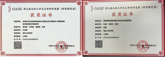 由杜慧慧老师指导、蒋世航等同学完成的《草莓采后灰霉病病原菌的分离鉴定及柠檬精油-壳聚糖保鲜液对其抑制作用的研究》项目和芮璐老师指导、杜鑫等同学完成的《辣椒果腐病致病菌分离及抗性基因筛选》项目均获国家三等奖、重庆赛区二等奖。
