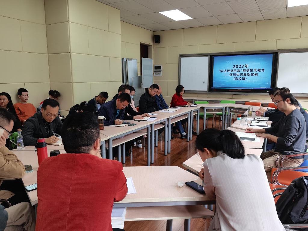 会上,骆孟鑫通报了教育部公开曝光的第十一批、第十二批违反教师职业行为十项准则的典型案例;经理肖国生、党总支副书记陈文剑、副经理汪开拓、纪检委员陈国维分别围绕典型案例“以案说法”,“以案说德”,“以案说责”,“以案说纪”。